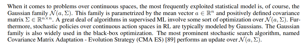P3) The Fisher information metric for the Gaussian family has a simple closed-form expression. This property enables the design of efficient and reasonably simple algorithms that follow the natural gradient update [22, 23, 24]. In particular, this property provides a theoretical justification for Natural Evolution Strategies in the black-box optimization [89].
