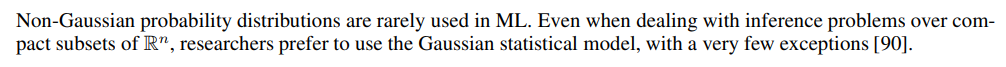 Such a domination of the Gaussian family has a strong justification. Indeed, this family posses a combination of advantages which render it a universal model in probabilistic ML. The only potential alternative is the family of multivariate Cauchy distributions. However, in most cases this family is immediately ruled out due to the fact that Cauchy distributions do not have finite moments. We list four favorable properties of the family N (a, Σ):
