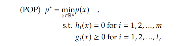 where π(π₯) is our polynomial objective and βπ(π₯), ππ(π₯) are our polynomial equality and inequality constraints respectively. However, in general, solving such POP to global optimality is NP-hard [9, 29]. To address this challenge, we leverage methods from algebraic geometry [9, 21], allowing us to approximate global solutions using convex optimization methods.