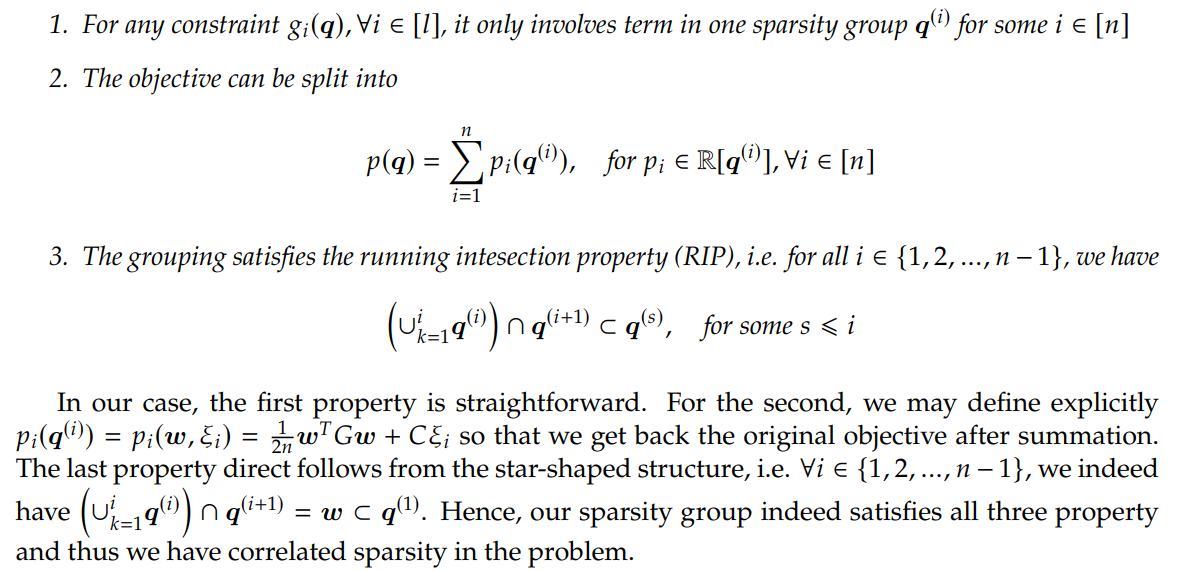 With correlated sparsity and data regularity (Putinarβs Positivestellentz outlined in Nie [9]), we are able to decompose the Qmodule generated by the entire set of decision variables into the Minkowski sum of Qmodules generated by each sparsity group of variables, effectively reducing the number of decision variables in the implementations. For a problem with only inequality constraints, which is our case for HSVM, the sparse POP for our problem reads as