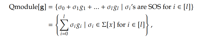 Next, we recall the definitions of quadratic module and its dual. Given a set of polynomials g = [π1, π2, ..., ππ], the quadratic module generated by g is defined as