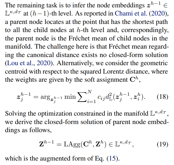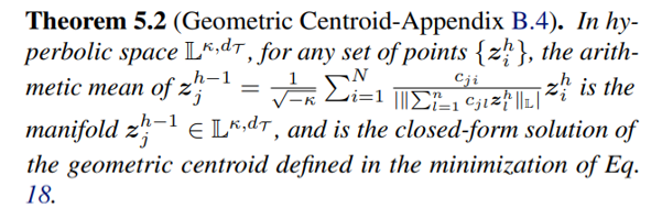 Remark. In fact, the geometric centroid in Theorem 5.2 is also equivalent to the gyro-midpoint in Poincare ball model ´ of hyperbolic space, detailed in Appendix B.4.