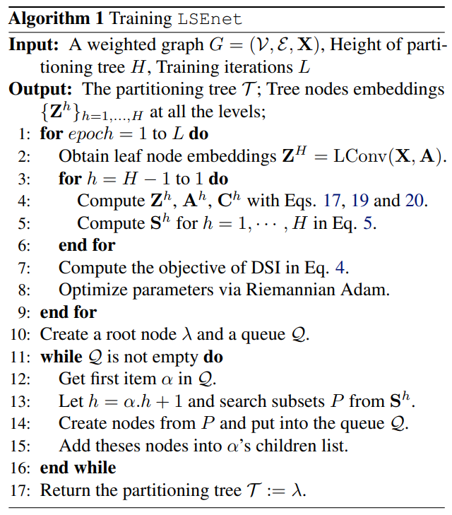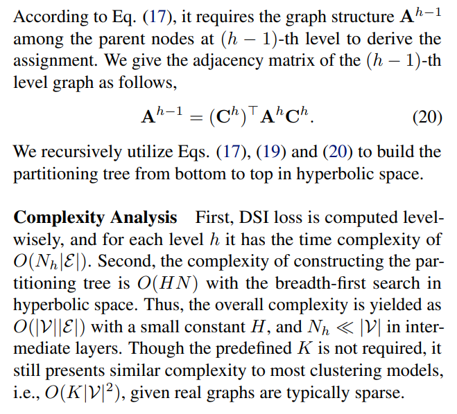 A primary challenge is that, in the partitioning tree, the node number at each internal level is unknown. To address this issue, we introduce a simple yet effective method, setting a large enough node number Nh at the h-th level. A large Nh may introduce redundant nodes and result in a relaxed partitioning tree. According to Theorem 4.8 established in Sec. 4.3, redundant nodes in the partitioning tree do not affect the value of structural entropy, and finally present as empty leaf nodes by optimizing our objective. Theoretically, if an internal level has insufficient nodes, the self-organization of the graph can still be described by multiple levels in the partitioning tree.