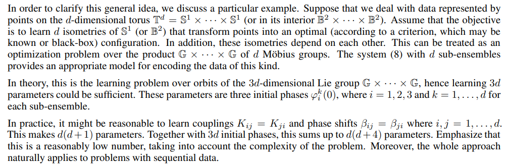 The system (10) with k oscillators is a convenient model of k coupled rotations in the n-dimensional vector space. Parameters to be learned are coupling strengths Kij . This model depends on a small number of parameters and can be trained efficiently. The obvious drawback is the limited representative power. There are several ways of increasing representative power, but they inevitably entail increased number of parameters. For instance, one can include several oscillators for each rotation.