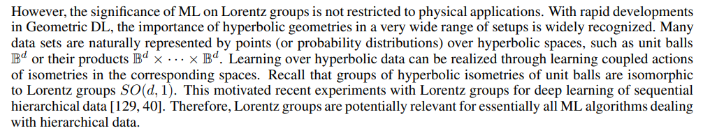 Computational physics is one of many fields that are being revolutionized with the advent of DL. Since Minkowski spacetime and its symmetries are one of central concepts in mathematical physics, DL models involving Lorentz groups have been investigated within this field [128].
